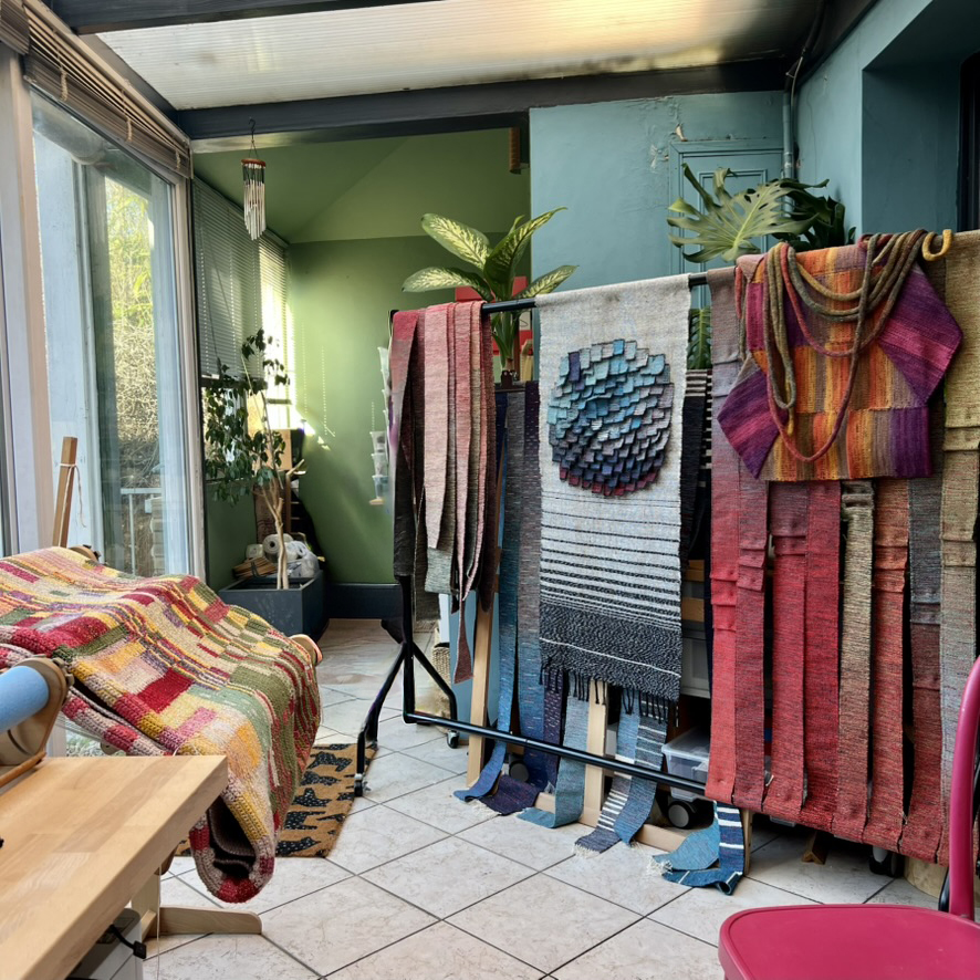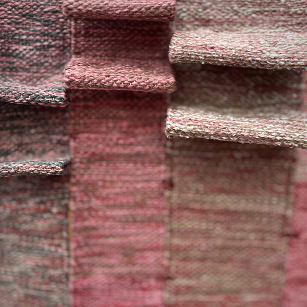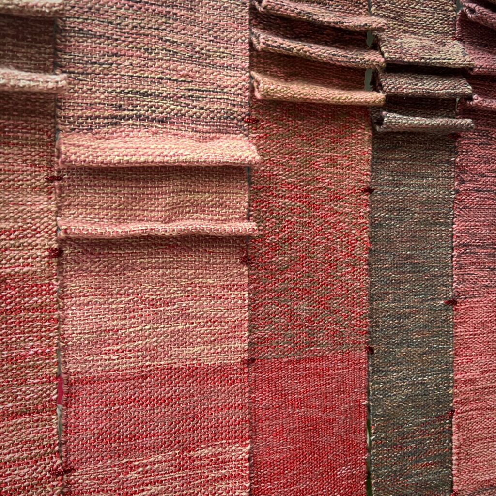 C’est en me souvenant du travail de Simone Pheulpin, de ses plis serrés, de sa manière de sculpter la matière textile sans couture apparente, en la retenant par des aiguilles, que j’ai choisi de sculpter mes bandes tissées. Son travail m’a toujours fascinée : la patience, la densité, la lenteur presque géologique du geste. Je lui emprunte ce principe pour prolonger une intuition : celle que la fixation peut être vivante, provisoire, respirante.